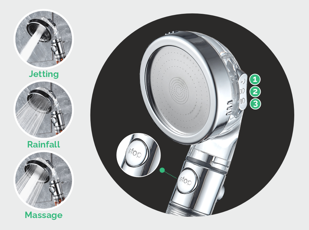 - 212% inrease in water velocity compared to standard shower heads