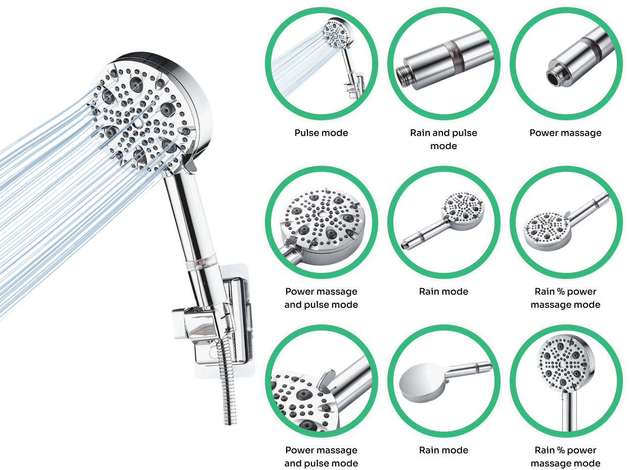 StoneStream™ Ecopower Shower Heads come with multiple spray settings, natural ionic filtration, and various kit options including handheld and wall-mounted shower heads. They are designed to improve water pressure and filter out impurities for healthier skin and hair.