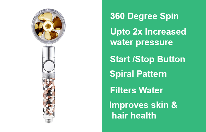 Głowica prysznicowa TurboFan wykorzystuje konstrukcję turbowentylatorową, która tworzy piękny wzór płynącej wody, a złoty wentylator również wygląda pięknie. Głowica prysznicowa oszczędza wodę i ma wycięte laserowo mikrootwory, które zwiększają prędkość wody, zapewniając nawet dwukrotnie większe ciśnienie wody, co zapewnia lepsze wrażenia pod prysznicem.